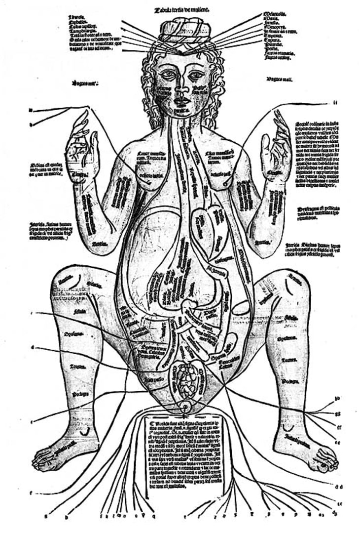 The Fasciculus Medicinae was the first illustrated medical manual to be put into print, in the late 1400s. Actually, it wasn’t so much a manual as a bound collection of separate works about medicine and anatomy. The anatomy was, shall we say, very interpretive in some cases, such as The Zodiac Man. Or in the case of The Incised Man, rather scary, giving detailed directions for where it was best to cut and bleed patients for whatever particular ailment they suffered (“Incisions in the two veins behind the ears, on both sides, are useful for improving memory and cleansing the face of pustules, and against all other spots on the face”). The book widely added to medical knowledge, for good or ill, in the Middle Ages, and the woodblock illustrations influenced the art of the period.